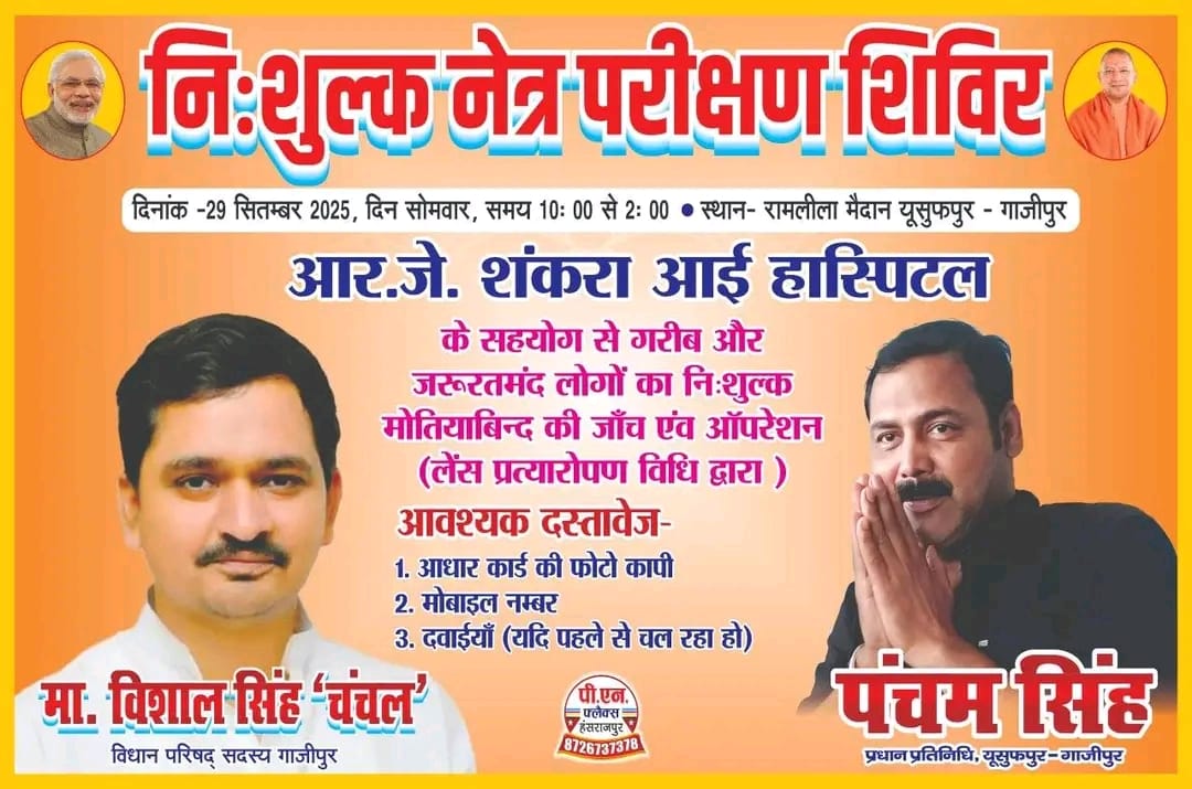 गाज़ीपुर : समाज के गरीब और जरूरतमंद लोगों के लिए स्वास्थ्य सेवाओं को सुलभ बनाने के उद्देश्य से यूसुफपुर, गाज़ीपुर में निःशुल्क नेत्र परीक्षण शिविर का आयोजन किया जा रहा है। यह शिविर दिनांक 29 सितम्बर 2025, सोमवार को सुबह 10 बजे से दोपहर 2 बजे तक रामलीला मैदान, यूसुफपुर में आयोजित होगा।