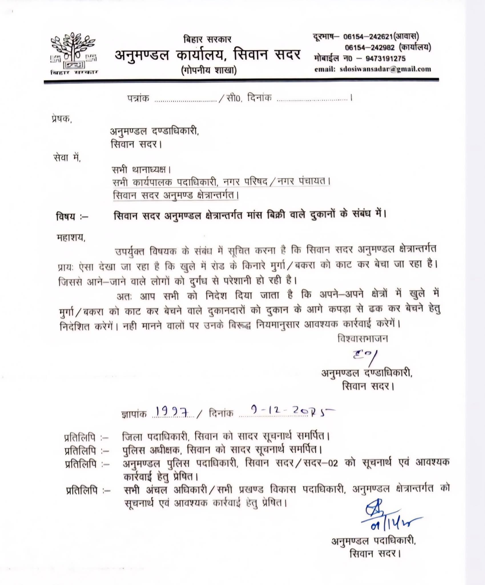 सदर एसडीओ आशुतोष कुमार गुप्ता ने इसे जनस्वास्थ्य और सार्वजनिक स्वच्छता से जुड़ा गंभीर मुद्दा बताते हुए सभी थानाध्यक्षों को आवश्यक दिशा-निर्देश जारी किए हैं। एसडीओ ने स्पष्ट कहा कि सड़क किनारे मीट बेचने वाले सभी दुकानदार यह सुनिश्चित करें कि मीट ढका हुआ रहे। इसके लिए दुकानदारों को विशेष रूप से कपड़ा ढककर मीट रखने का निर्देश दिया गया है, ताकि दुर्गंध कम हो और स्वच्छता बनी रहे।