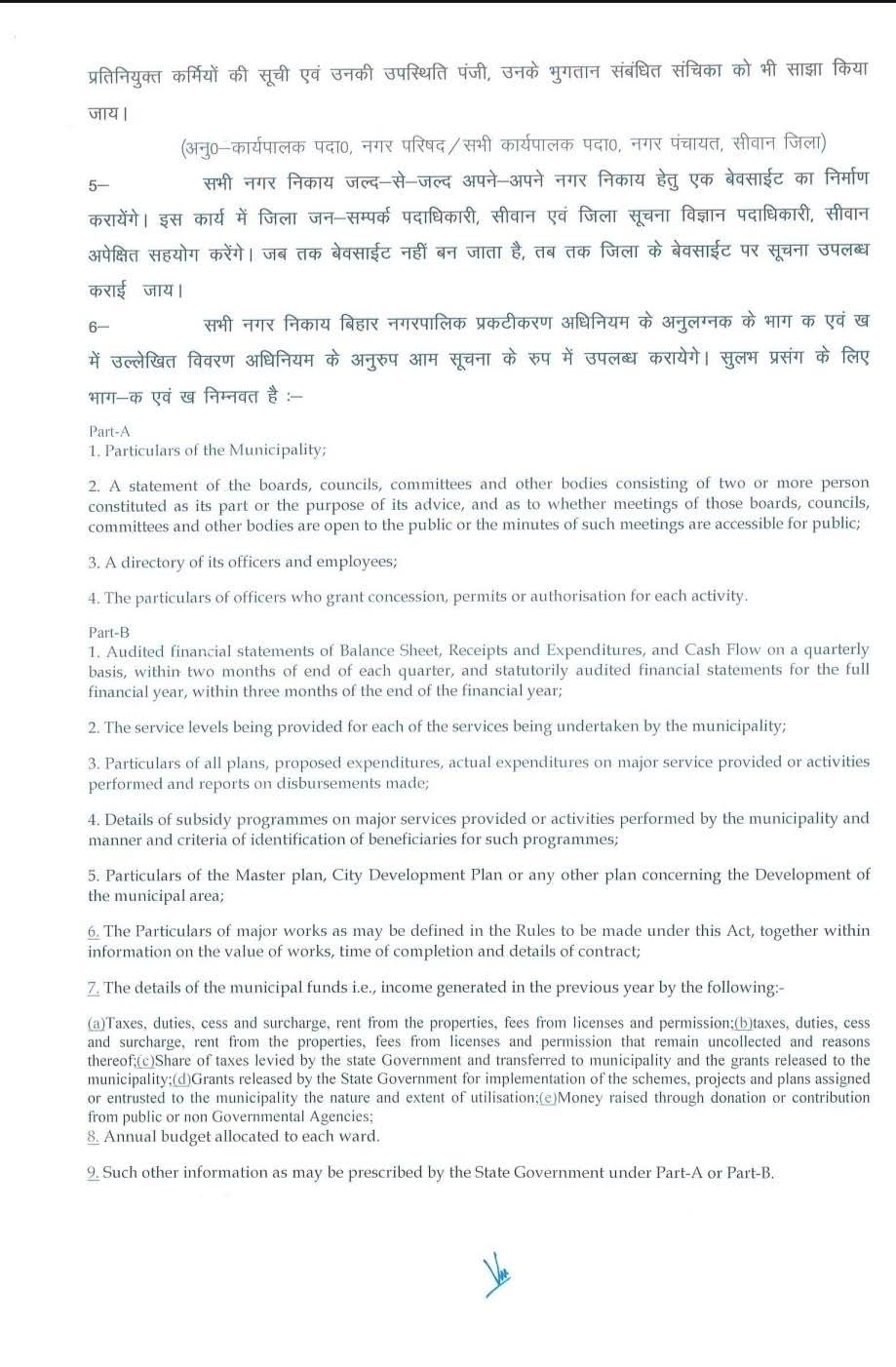 यह आदेश बिहार नगरपालिका अधिनियम, 2007 की धारा 65 एवं 66, बिहार सरकार के पत्रांक-2663/न०वि०आ०वि० दिनांक 25.05.2015, बिहार नगरपालिका प्रकटीकरण अधिनियम की धारा 3 एवं 4 तथा सूचना का अधिकार अधिनियम, 2005 की धारा 4(1)(ए) एवं 4(1)(बी) के प्रावधानों के आलोक में जारी किया गया है। इसके तहत नगर निकायों को कई अहम जानकारियां ऑनलाइन उपलब्ध कराने का निर्देश दिया गया है।