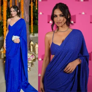 कशिश ने Royal Blue कलर की Pre-Draped साड़ी चुनी है, जिसमें मैचिंग स्टोन और सीक्वेंस वर्क हैं। यह लुक न सिर्फ Elegant बल्कि Glamorous भी है, खासतौर पर उन महिलाओं के लिए जो एक ट्रेडिशनल लेकिन कम कोशिश वाला लुक चाहती हैं। उनके साथ सिल्वर क्लच पर्स और वेवी हेयरस्टाइल ने पूरी स्टाइल को एक Polished फिनिश दिया है।