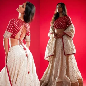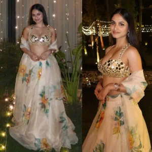 दूसरे लुक में कशिश ऑर्गेंजा सिल्क फ़्लोरल White Lehenga में बेहद खूबसूरत नजर आईं। हल्का वेविंग मेकअप, हेवी मिरर वर्क वाला गोल्डन ब्लाउज और बारीक Details ने इसे एक ट्रेंडी लेकिन Traditional twist दी है। यह लहंगा उन लोगों के लिए बिल्कुल परफेक्ट है जो Bridesmaid या सगाई के फ़ंक्शन्स में standout लगना चाहते हैं।