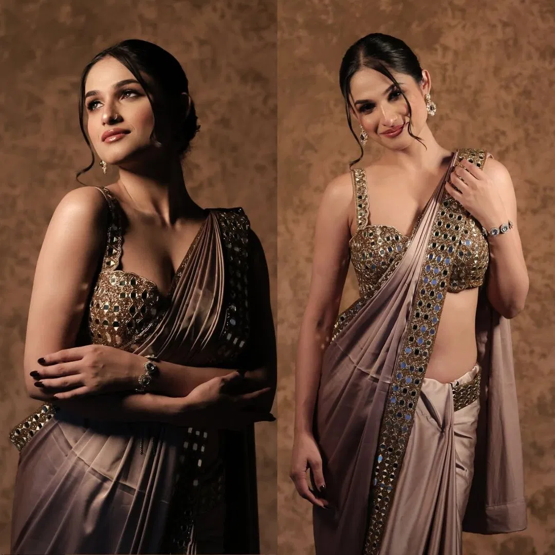 मौवे ब्राउन कलर की Satin-Silk Saree में उन्होंने कम से कम Accessories का उपयोग किया, लेकिन Mirror Work डिटेलिंग ने इसे Eye-Catching लुक दिया। Sleek Hair और Glam Makeup ने इस Saree को एक Sophisticated Look में बदल दिया।