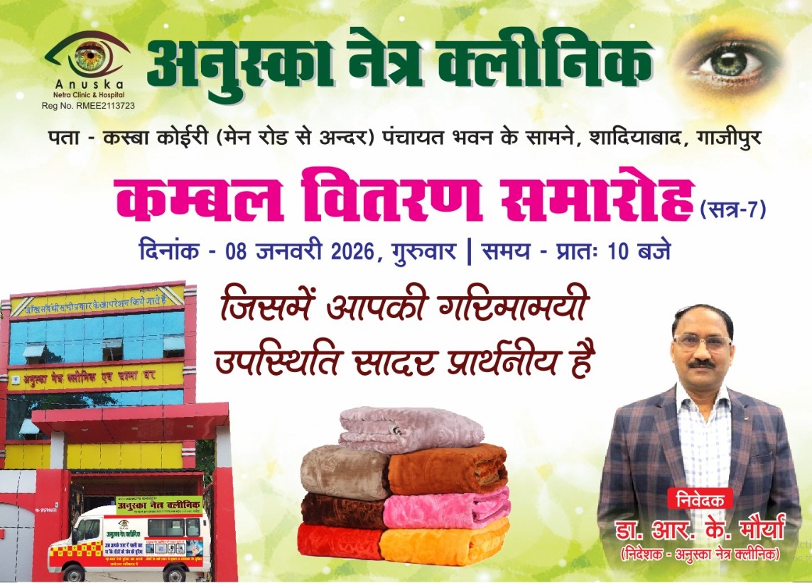 गाजीपुर : शादियाबाद क्षेत्र में स्वास्थ्य सेवाओं के साथ-साथ सामाजिक सरोकारों को मजबूत करने की दिशा में निरंतर कार्य कर रहे अनुस्का नेत्र क्लीनिक एवं हॉस्पिटल (Anuska Netra Clinic & Hospital) द्वारा कम्बल वितरण समारोह (Blanket Distribution Ceremony) का आयोजन किया जा रहा है। यह कार्यक्रम सत्र-7 के अंतर्गत दिनांक 08 जनवरी 2026, गुरुवार को प्रातः 10 बजे आयोजित होगा। यह आयोजन कस्बा कोईरी, शादियाबाद स्थित पंचायत भवन के सामने, मेन रोड से अंदर अनुस्का नेत्र क्लीनिक परिसर में संपन्न होगा। इस अवसर पर क्षेत्र के गणमान्य नागरिकों, समाजसेवियों और आमजन की गरिमामयी उपस्थिति सादर प्रार्थनीय की गई है।